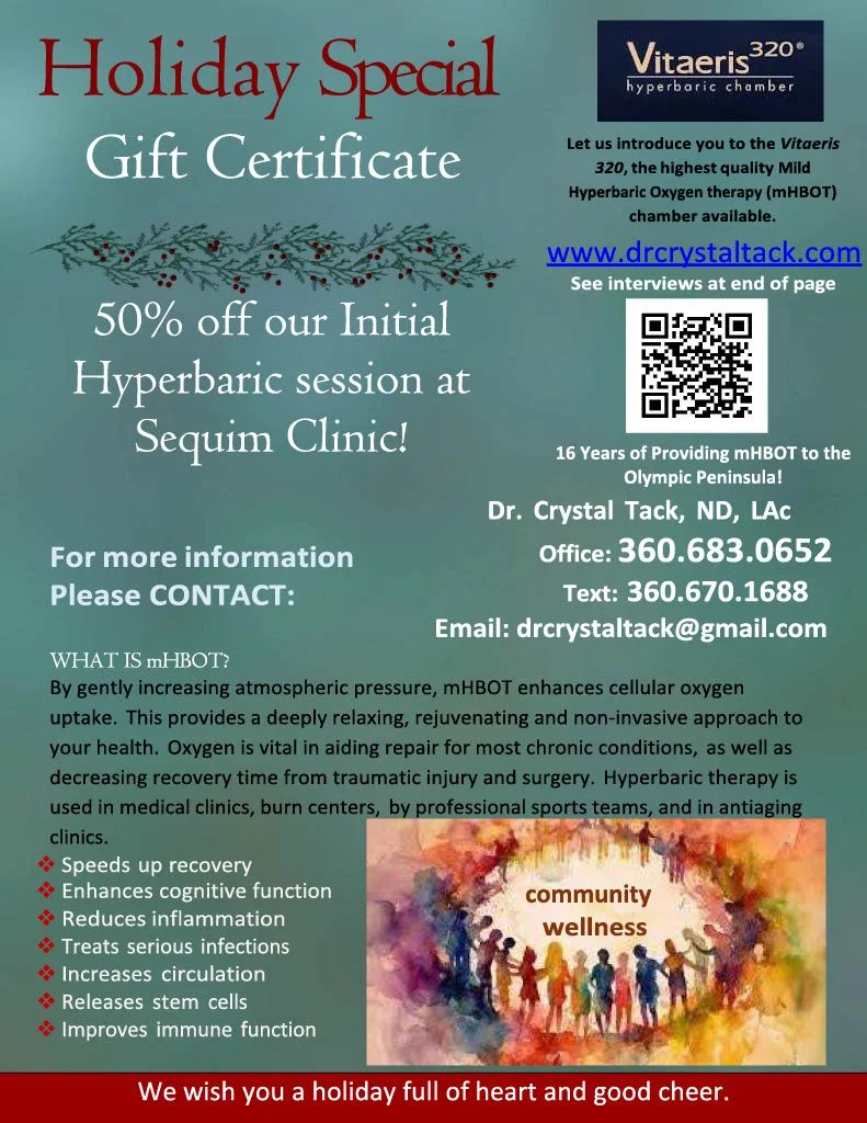 We are prepared to meet your needs with a number of modalities including Naturopathic care (which may include lab studies or other diagnostic procedures as needed to create healing orientated solutions which may include nutrition), Acupuncture, mild hyperbaric therapy, Aroma therapy, G5 massage, deep belief release and more.